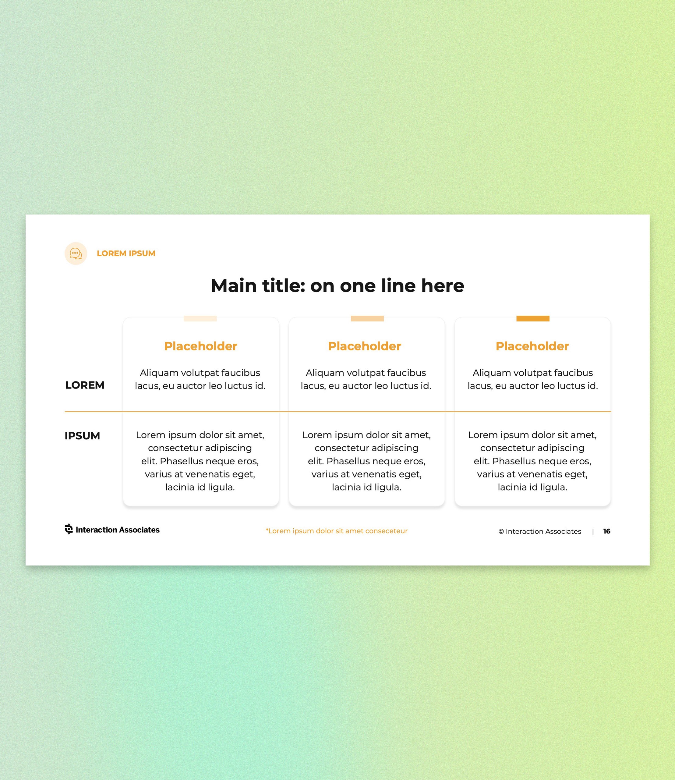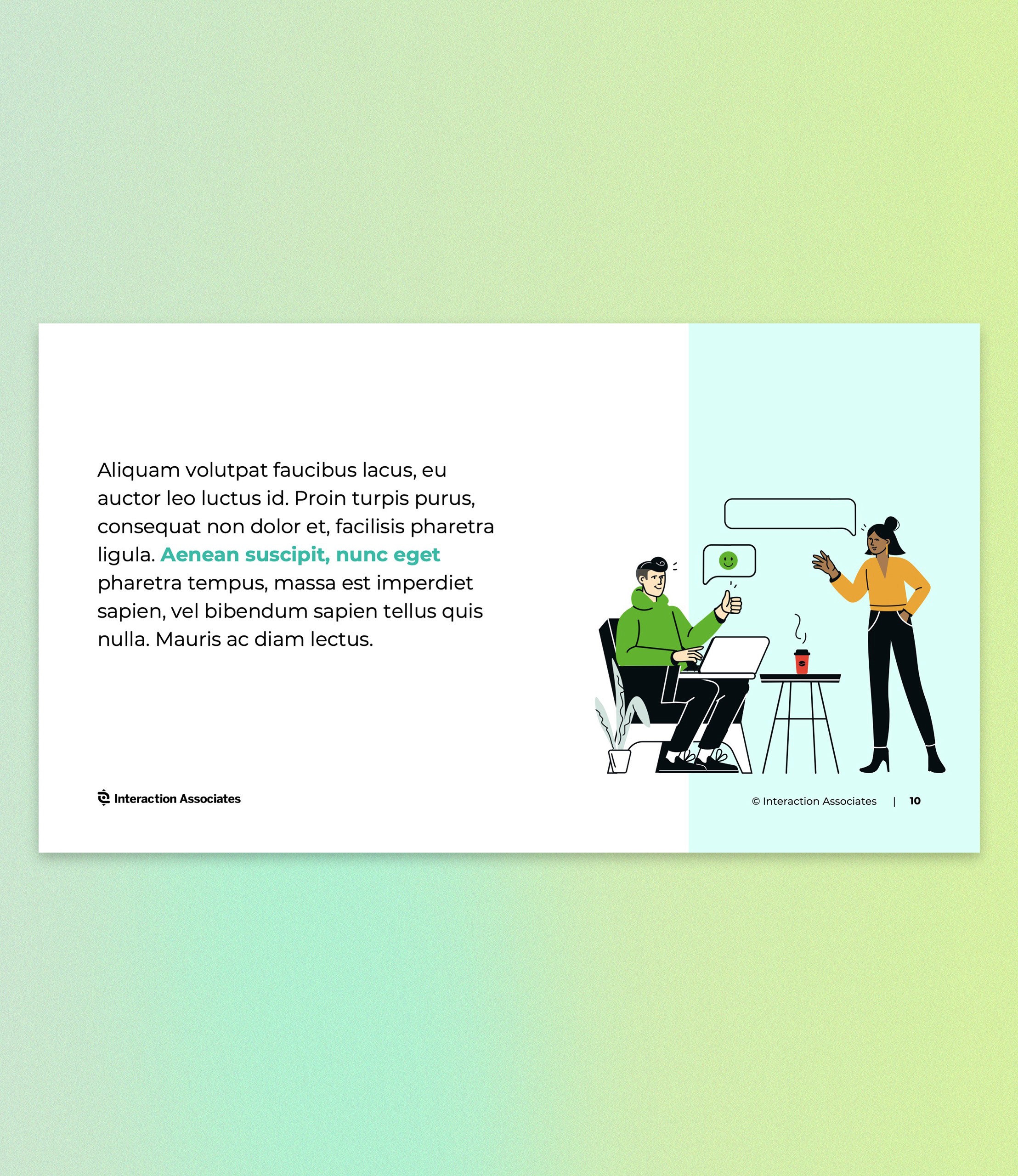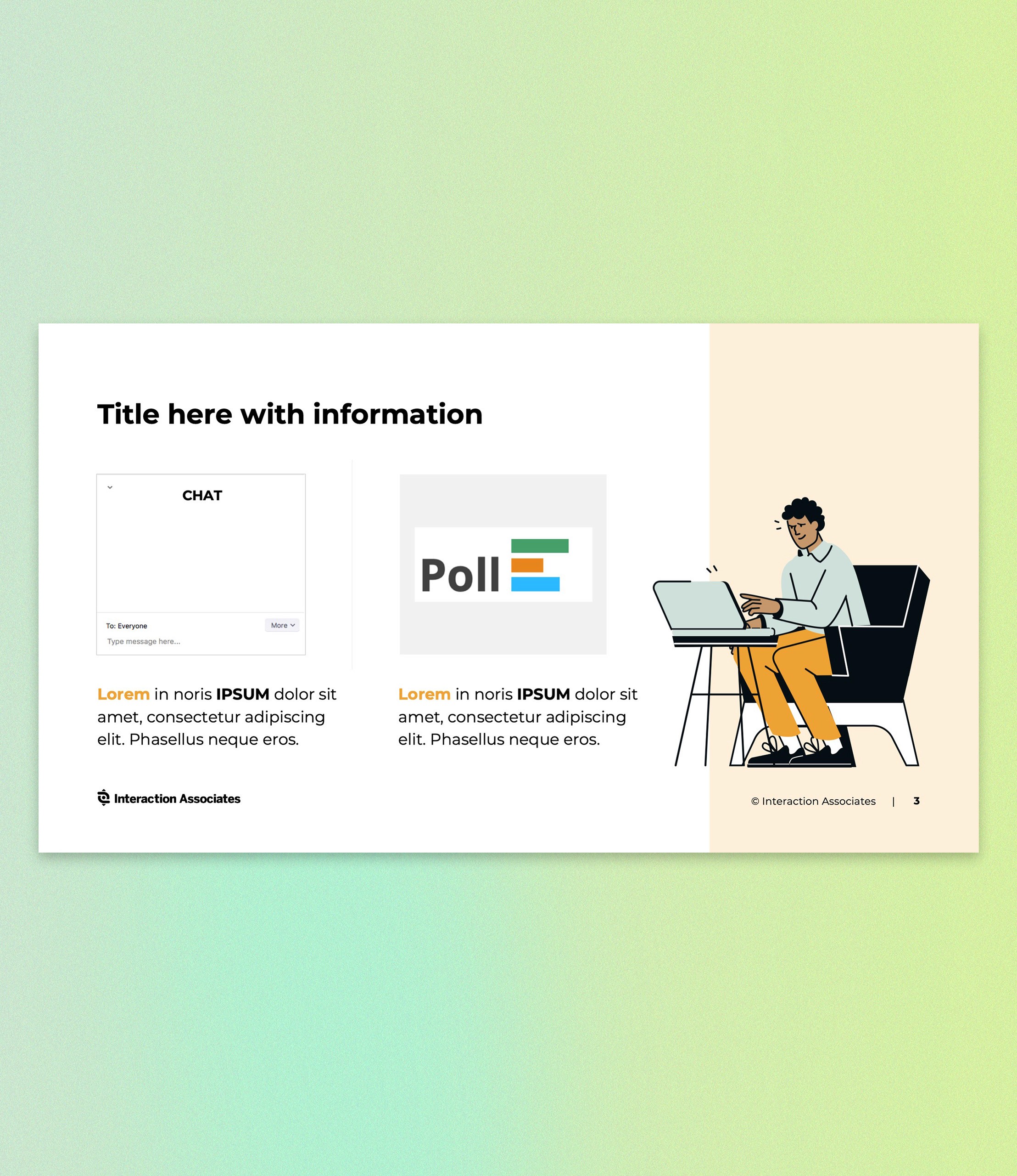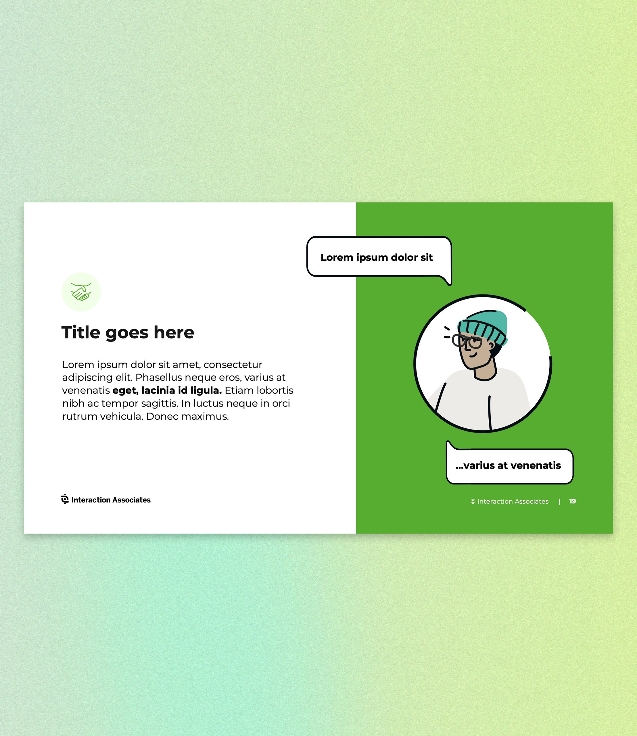 This project refined Interaction Associates’ webinar content from a disparate set of materials into a cohesive, visually engaging, and learner‑friendly suite. By clarifying structure, enhancing hierarchy, and modernizing visuals, the redesigned assets now better support IA’s mission of helping leaders and teams collaborate effectively, while making their virtual learning experiences more intuitive and impactful for audiences worldwide.